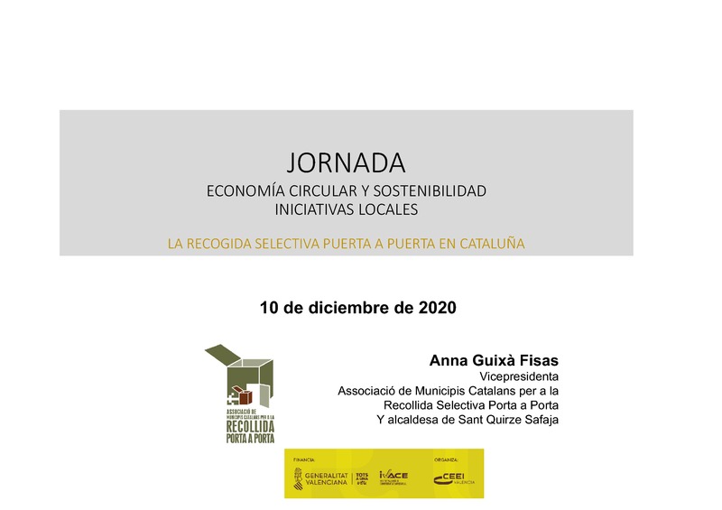 Presentación utilizada por Anna Guixà Fisas, vicepresidenta de la Associació de Municipis Catalans per a la Recollida Selectiva Porta a Porta y alcaldesa del ayuntamiento de Sant Quirze Safaja, en la sesión Economía Circular y Sostenibilidad. Iniciativas locales incluida en el Ciclo Foro Emprendimiento con Talento Economía Circular y Sostenibilidad.
