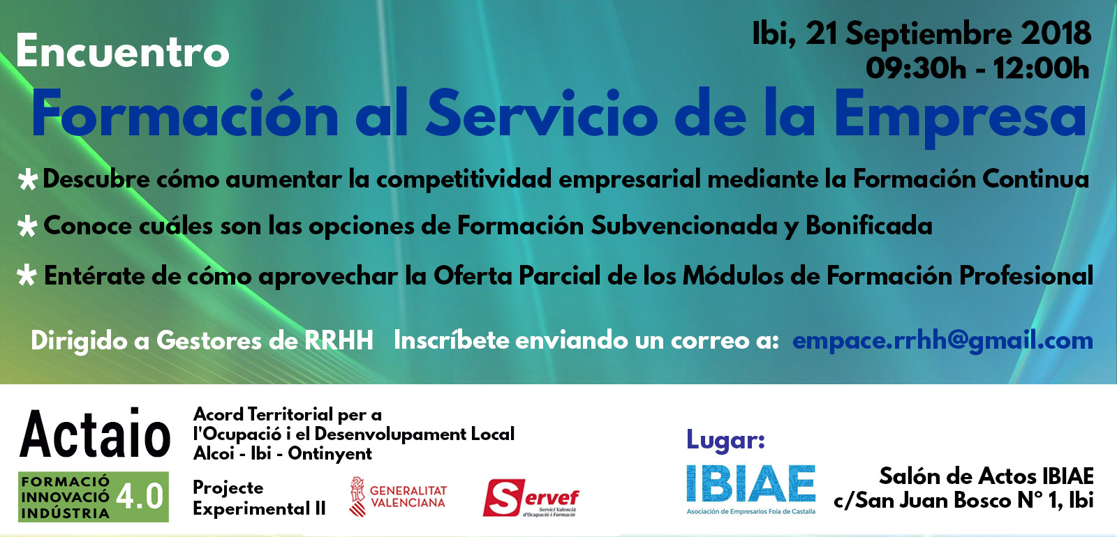 Tècnics de la Fundación Estatal para la Formación en el Empleo seran els ponents en l'esdeveniment que se celebrarà en les instal·lacions d’IBIAE