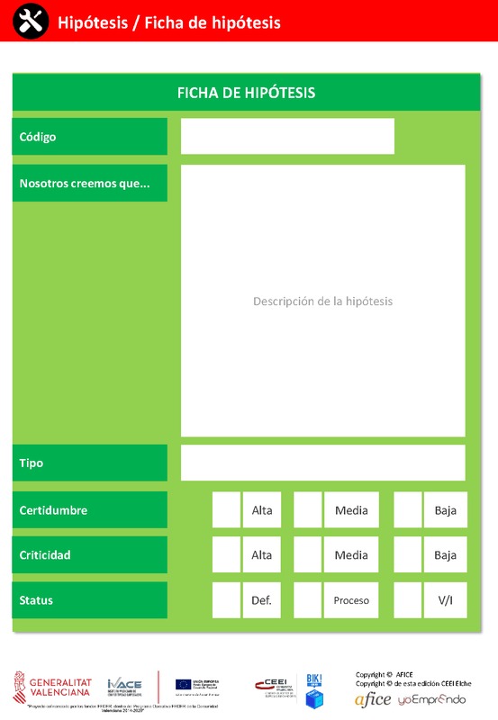 Descargar archivo (.pdf 450Kb)Ficha de trabajo en blanco de la fase EXPERIMENTACIÓN perteneciente al programa BIK Startup. Puedes ampliar la información de esta ficha en el Manual de Experimentación y el resto de materiales prácticos.