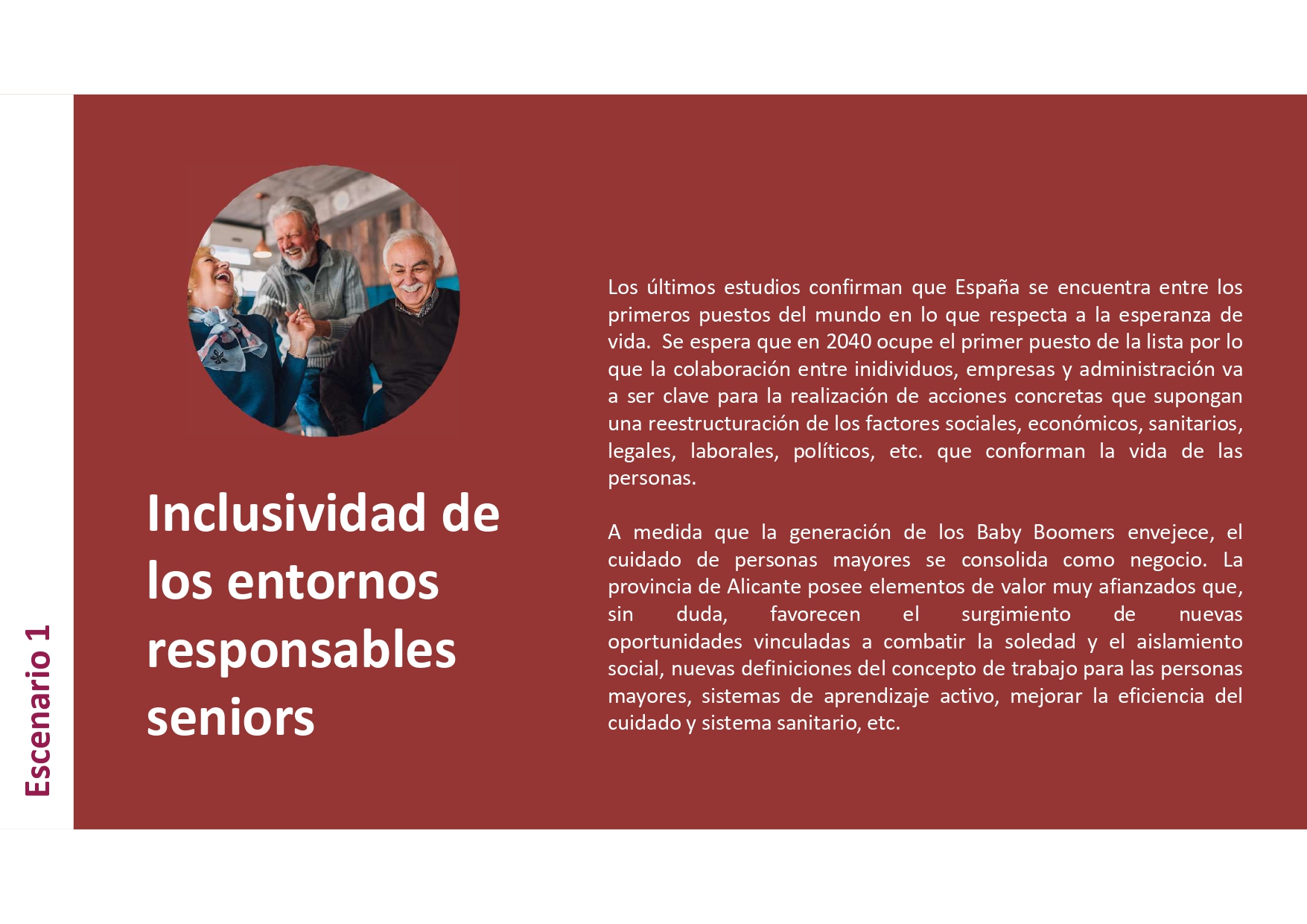 1. Escenario "Inclusividad de entornos responsables seniors",  en un contexto de uso que plantea: