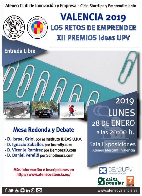 El lunes 28 de enero a las 20 horas, la Sala de Exposiciones del Ateneo Mercantil de Valencia albergará una mesa redonda en la que se debatirá sobre emprendimiento, bajo el título “Valencia 2019: Los retos de emprender – XII PREMIOS Ideas UPV”, y en el marco del Ciclo Ateneo StartUps y Emprendimiento.