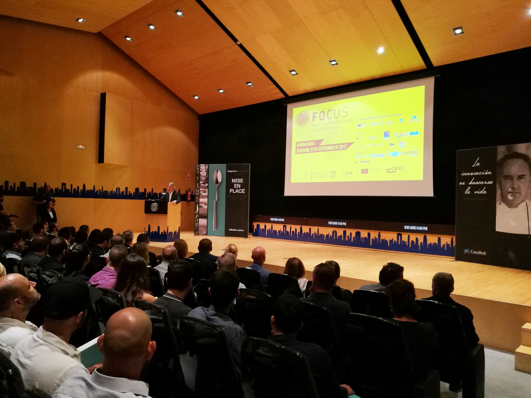 Accedemos al auditorio y nos recibe un gran panel desde el escenario: “la innovación es buscarse la vida”, reza la cita de Ferran Adrià. El público aprovecha el lapso de tiempo, antes del inicio, para compartir experiencias y para improvisar un espontáneo networking. De pronto, un grupo de periodistas gráficos, con los flashes y disparos de cámara, anuncia la entrada del protagonista. Le acompañan hasta su asiento en primera fila donde aprovechan para tomar su imagen con el auditorio de fondo.
