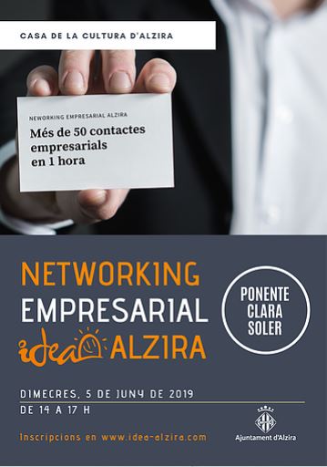 L'Ajuntament d'Alzira, mitjançant IDEA, organitza la 5ª Jornada de Networking Empresarial que tindrà lloc el dimecres 5 de juny, a la Casa de la Cultura d'Alzira, en horari de 14 a 17 hores
