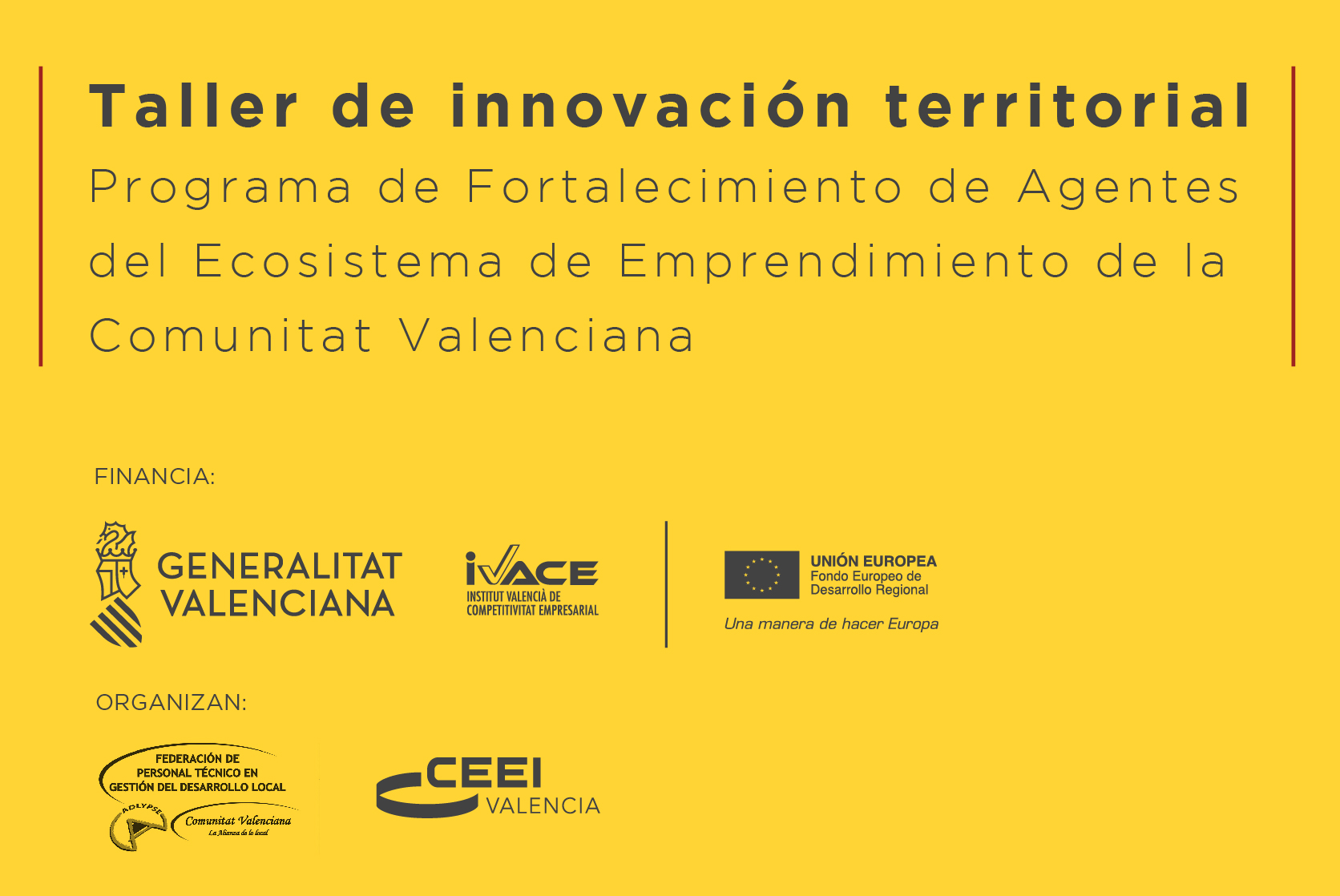 El taller Innovación territorial: Itinerarios para el emprendimiento y el desarrollo del territorio es una iniciativa de los CEEI de la Comunidad Valenciana y ADLYPSE en colaboración con las universidades de Alicante, Valencia y Castellón y con los grupos de investigación GRIDET, GEOBINDEL y IIDL.