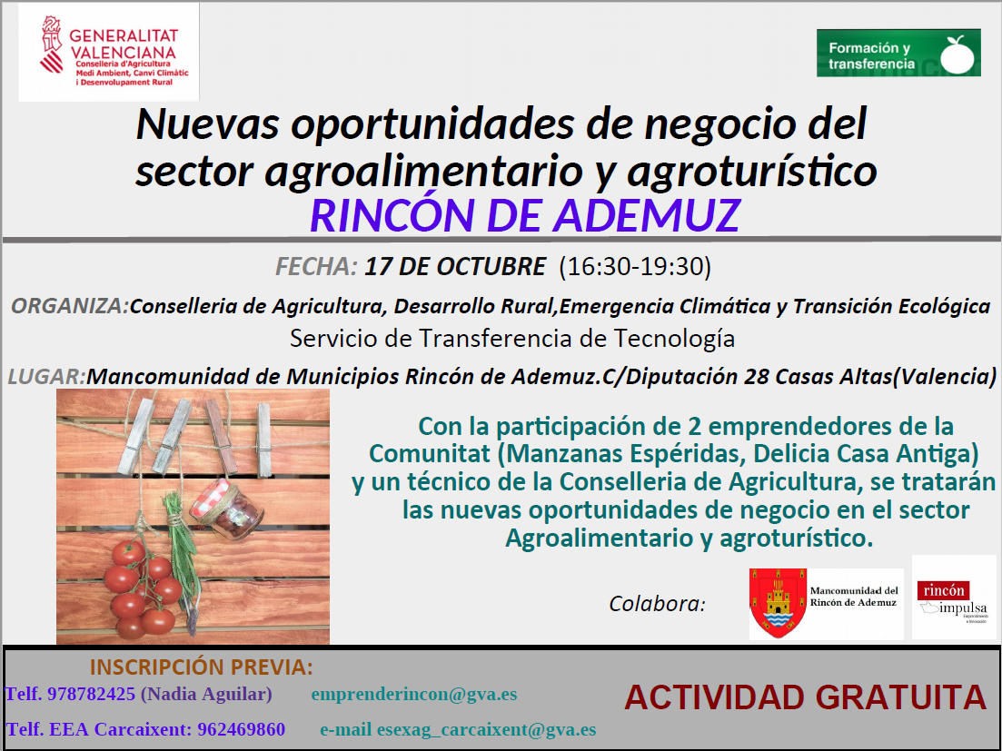 La Conselleria d'Agricultura, a través de las Estaciones Experimentales Agrarias de Vila-real y Carcaixent, pertenecientes al Servicio de Transferencia de Tecnología, y en colaboración con la Mancomunidad de municipios Rincón de Ademuz, organiza esta Jornada sobre oportunidades de negocio agroturístico y agroalimentario, contando para ello con la intervención de dos emprendedores agroalimentarios, además de un técnico de la Generalitat Valenciana especializado en estos temas.