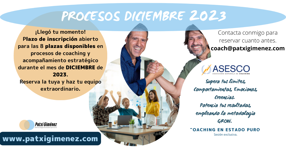 Te informo del plazo de inscripción para las 8 plazas disponibles en procesos de coaching y acompañamiento estratégico durante el mes de diciembre de 2023.