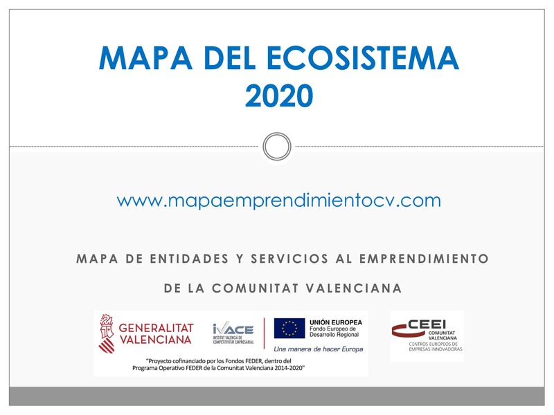 El Mapa de Entidades y Servicios al Emprendimiento sitúa sobre el mapa el conjunto de Entidades y Servicios que principalmente, en el ámbito de la Comunitat Valenciana, prestan apoyo al emprendimiento innovador a través de toda la "cadena de valor", abarcando servicios que van desde la motivación y creación de vocaciones empresariales, hasta la innovación, internacionalización o/y el rápido crecimiento empresarial.