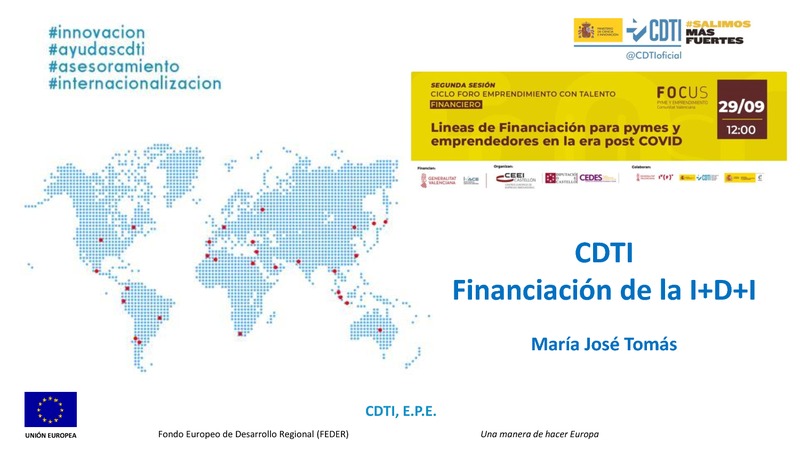Ponencia de Mª José Tomás, del Departamento  de Promoción Institucional y Cooperación Territorial  del CDTI, durante la sesión sobre "Líneas de Financiación para pymes y emprendedores en la era post COVID que tuvo lugar el 29 de septiembre.