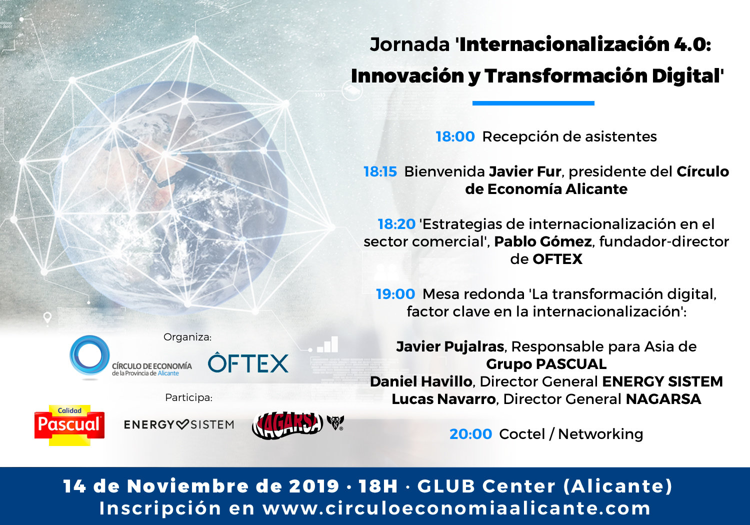 El Círculo de Economía de la Provincia de Alicante, junto a OFTEX (consultoría en comercio exterior), organizan el 14 de noviembre, a las 18:00h, la jornada ‘Internacionalización 4.0: Innovación y transformación digital’ en Glub Center (C/ Italia nº22) dirigida a empresarios y directivos de la pyme alicantina.