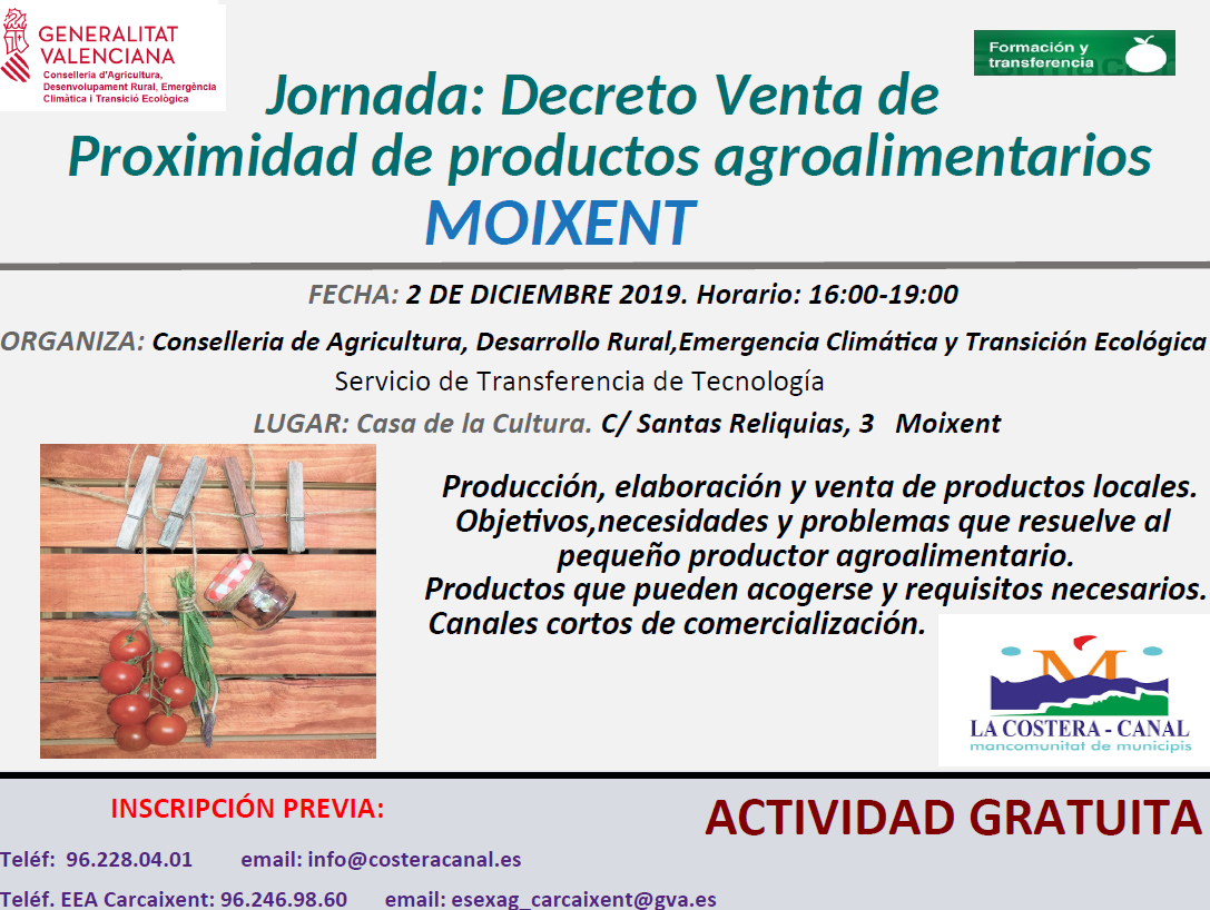 La Conselleria d'Agricultura, a través de las Estaciones Experimentales Agrarias de Vila-real y Carcaixent, pertenecientes al Servicio de Transferencia de Tecnología, y en colaboración con la Mancomunitat La Costera-Canal, organiza esta Jornada sobre el nuevo Decreto del Consell de Venta de Proximidad de productos primarios y agroalimentarios, contando para ello con la intervención de una de las redactoras de dicho Decreto, además de un técnico de la Conselleria de Agricultura especializado en comercialización.