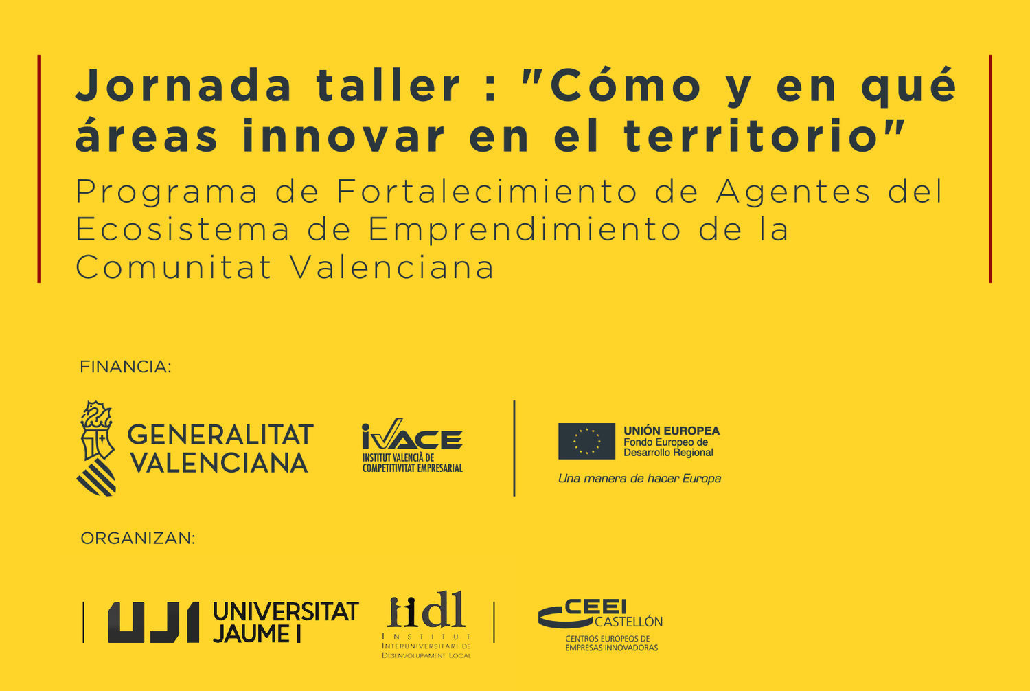 El taller "Como y en qué áreas innovar en el territorio" forma parte de los Itinerarios para el emprendimiento y el desarrollo del territorio para Agentes Ecosistema Emprendedor CV , y es una iniciativa de los CEEI de la Comunidad Valenciana y el grupo de investigación  IIDL.