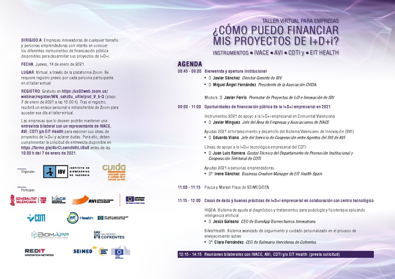 En este taller virtual, organizado por el Instituto de Biomecánica (IBV) y la Asociación para el Cuidado de la Calidad de Vida (CVIDA) en colaboración con el Institut Valencià de Competitivitat Empresarial (IVACE), la Agència Valenciana de la Innovació (AVI), CDTI, EIT Health, REDIT y EEN SEIMED, los participantes podrán conocer de la mano de los propios organismos gestores las condiciones de participación y novedades para 2021 en diferentes programas de financiación de la I+D+i empresarial. Además, varias empresas presentarán sus casos de éxito y buenas prácticas en proyectos de I+D+i.