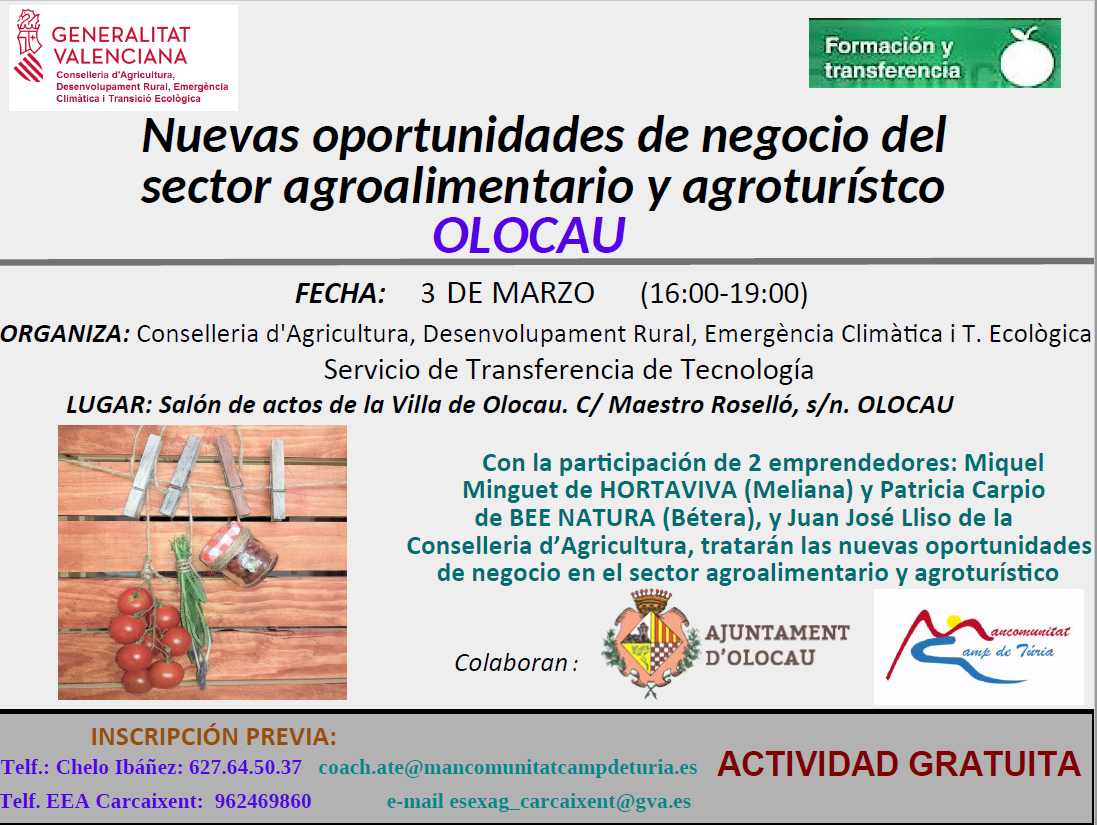 La Conselleria d'Agricultura, a través de las Estaciones Experimentales Agrarias de Vila-real y Carcaixent, pertenecientes al Servicio de Transferencia de Tecnología, y en colaboración con el Ayto. de Olocau y la Mancomunitat del Camp de Túria, organiza esta Jornada sobre oportunidades de negocio agroturístico y agroalimentario, contando para ello con la intervención de dos emprendedores agroalimentarios, además de un técnico de la Generalitat Valenciana especializado en estos temas.