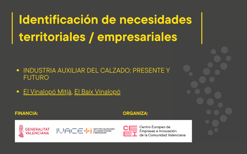 INDUSTRIA AUXILIAR DEL CALZADO: PRESENTE Y FUTURO DEL SECTOR es un proyecto de exploración de nuevas oportunidades de crecimiento en el territorio vinculadas al calzado, que ha recogido un total de 6 actuaciones estratégicas atendiendo al análisis de las tendencias del sector vinculadas a la tecnología y ciencia; economía y mercado ; y sociedad y cultura que han permitido proyectar escenarios de futuro y promover acciones.