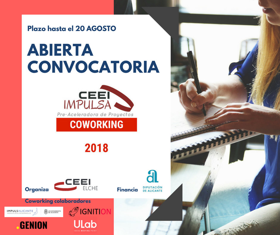CEEI IMPULSA COWORKING 2018 es una convocatoria que forma parte del  Programa JOVEN EMPRESA INNOVADORA 2018, subvencionado por la Excelentísima Diputación de Alicante.