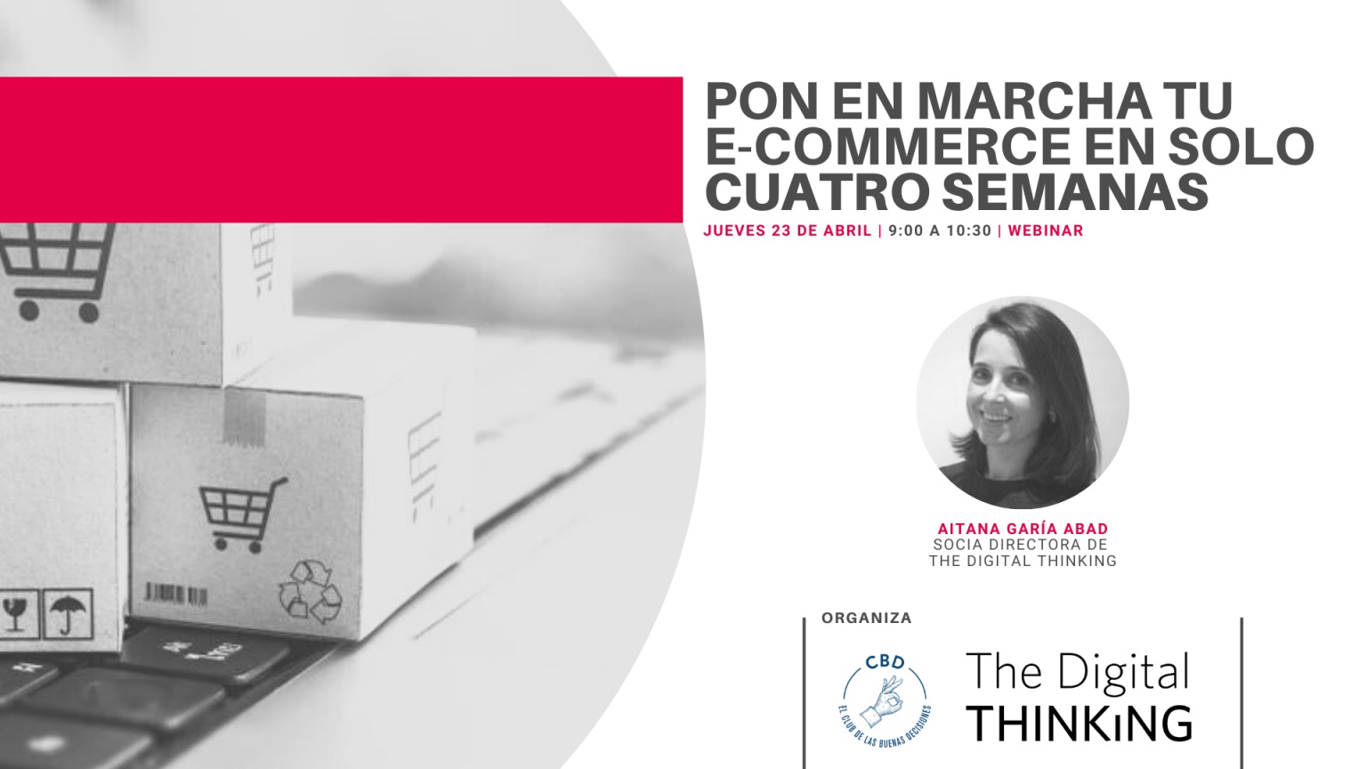 El próximo jueves 23 de abril, de 9:00 a 10:30, llevaremos a cabo el Webinar «Pon en marcha tu E-Commerce en solo 4 semanas» a través de la colaboración entre El Club de las Buenas Decisiones y The Digital Thinking.