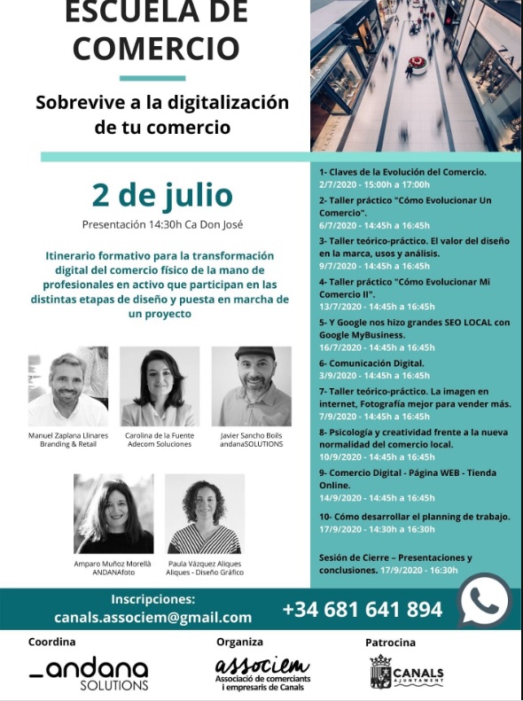 Con esta propuesta de acción, el próximo 2 de julio andanaSOLUTIONS pone en marcha la 1ª Edición de la Escuela de Comercio de Canals, Un itinerario formativo innovador de 10 jornadas de la mano de profesionales en activo que participan en las distintas etapas de diseño y puesta en marcha de cualquier proyecto.