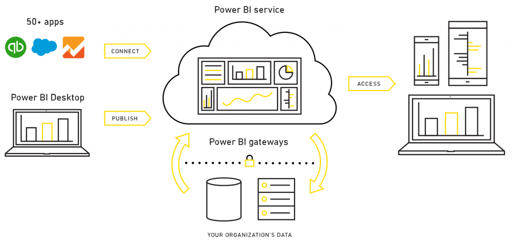 Power BI puede unificar todos los datos de su organización, ya sea en la nube o localmente. Con Power BI Gateways, puede conectar bases de datos SQL Server, modelos de Analysis Services y muchos otros orígenes de datos a los mismos paneles en Power BI. Si ya cuenta con portales o aplicaciones de creación de informes, inserte los informes y paneles de Power BI para disfrutar de una experiencia unificada.