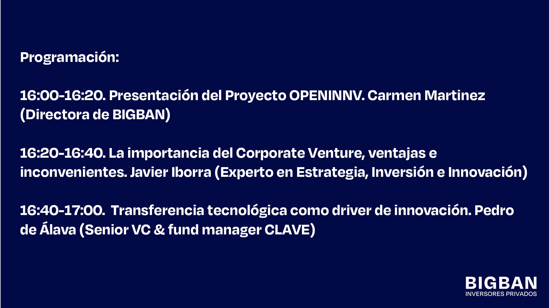 FECHA Y HORA: El próximo día 26 de enero a las 16:00h presentamos OPENINNV, el nuevo proyecto de innovación abierta desarrollado por BIGBAN Inversores Privados.