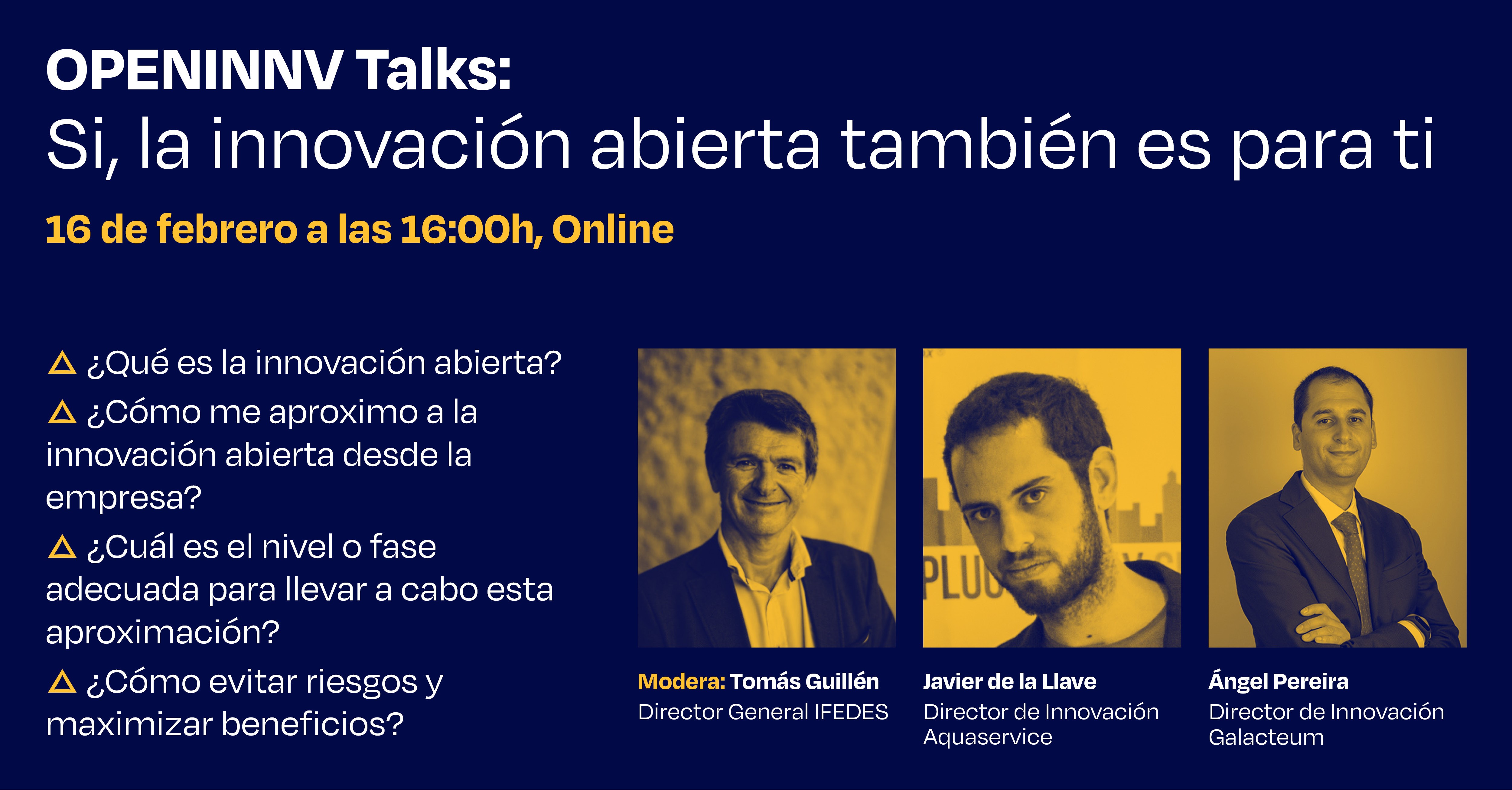 El próximo día 16 de febrero a las 16:00h presentamos OPENINNV TALKS, la nueva serie de webinars de promoción y difusión de la innovación abierta.