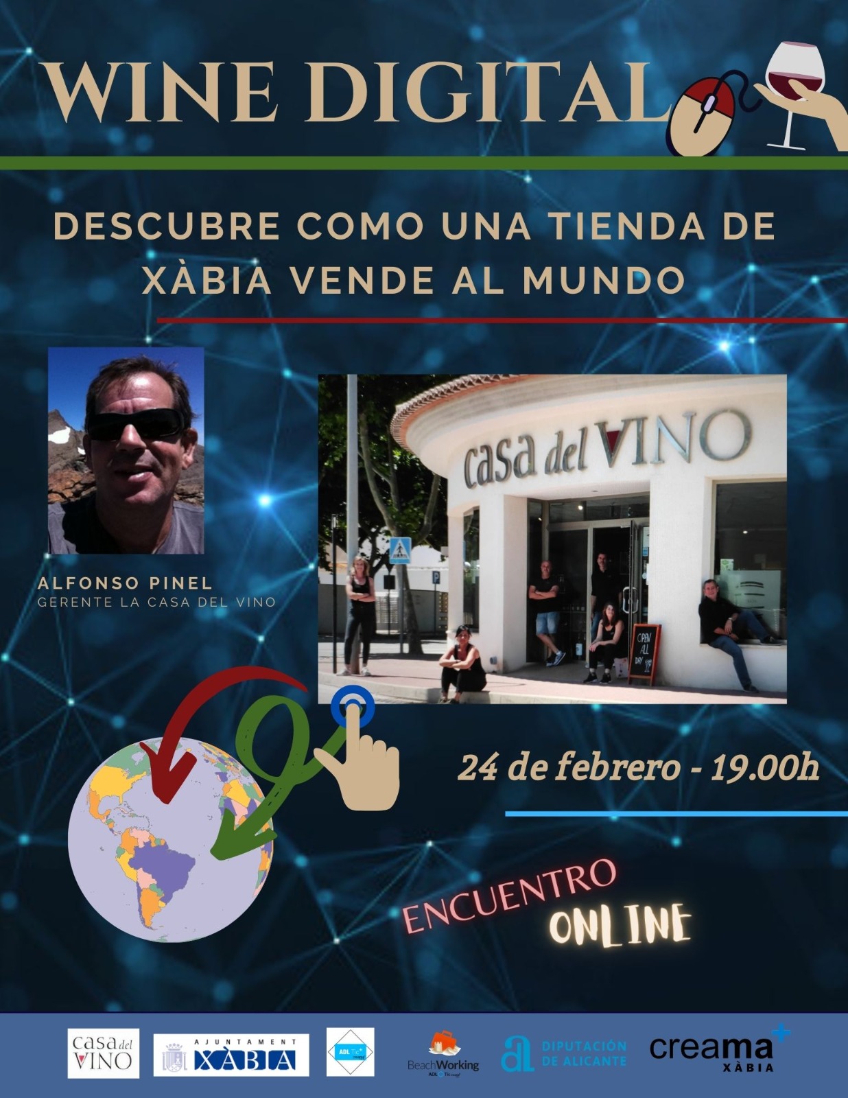 El Wine Digital es un evento del proyecto Beachworking que se ha venido consolidando en los últimos años, ya que ante el planteamiento de la pregunta "¿El vino y las nuevas tecnologías pueden ir unidos?" se descubrió que había muchos emprendedores que habían apostado por digitalizar y transformar su pasión en negocio. De ahí surgió el primer "Girls and Wine" donde se contaron 3 experiencias con tres mujeres que actualmente se dedican a producir y promocionar sus propios caldos. El año pasado se realizó exponiendo los casos de tres jóvenes emprendedores de la comarca con mucho éxito y, este año, se ha planteado en formato digital para conocer de primera mano como una empresa tan arraigada en Xàbia como es la Casa del Vino ha podido crear su tienda online y, actualmente, estar vendiendo en todo el mundo.