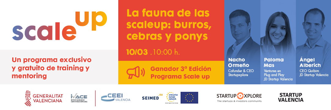 Nacho Ormeño, Cofundador y CEO de StartXplorePaloma Mas, Ventrure en Plug and Play Tech Center y Ángel Alberich CEO de Quibim, ambos miembros de la Junta Directiva de Startup Valencia, analizarán y desgranarán la fauna de las scaleups y todos los tips necesarios para detectar cuál es momento idóneo para dar el salto.