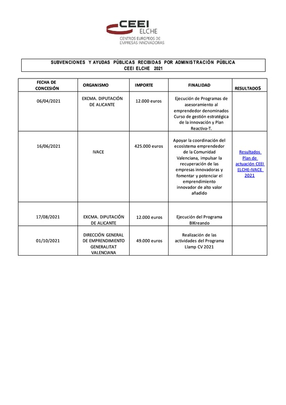 SUBVENCIONES Y AYUDAS PÚBLICAS RECIBIDAS POR ADMINISTRACIÓN PÚBLICA- CEEI ELCHE 2021