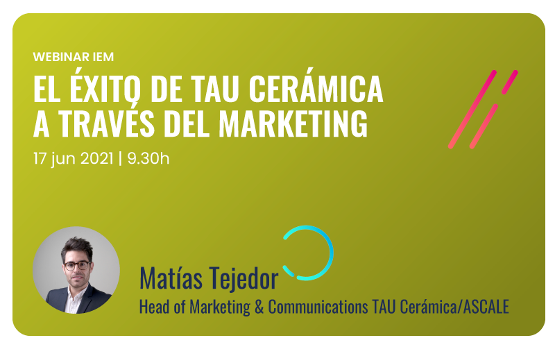 En el próximo #WebinarIEM, Matías Tejedor Marco, Head of Marketing & Communications en TAU Cerámica y ASCALE y antiguo alumno de IEM del Máster de Marketing Digital, te contará los secretos que hay detrás de la estrategia de marketing de TAU Cerámica para seguir siendo un referente del sector cerámico español.