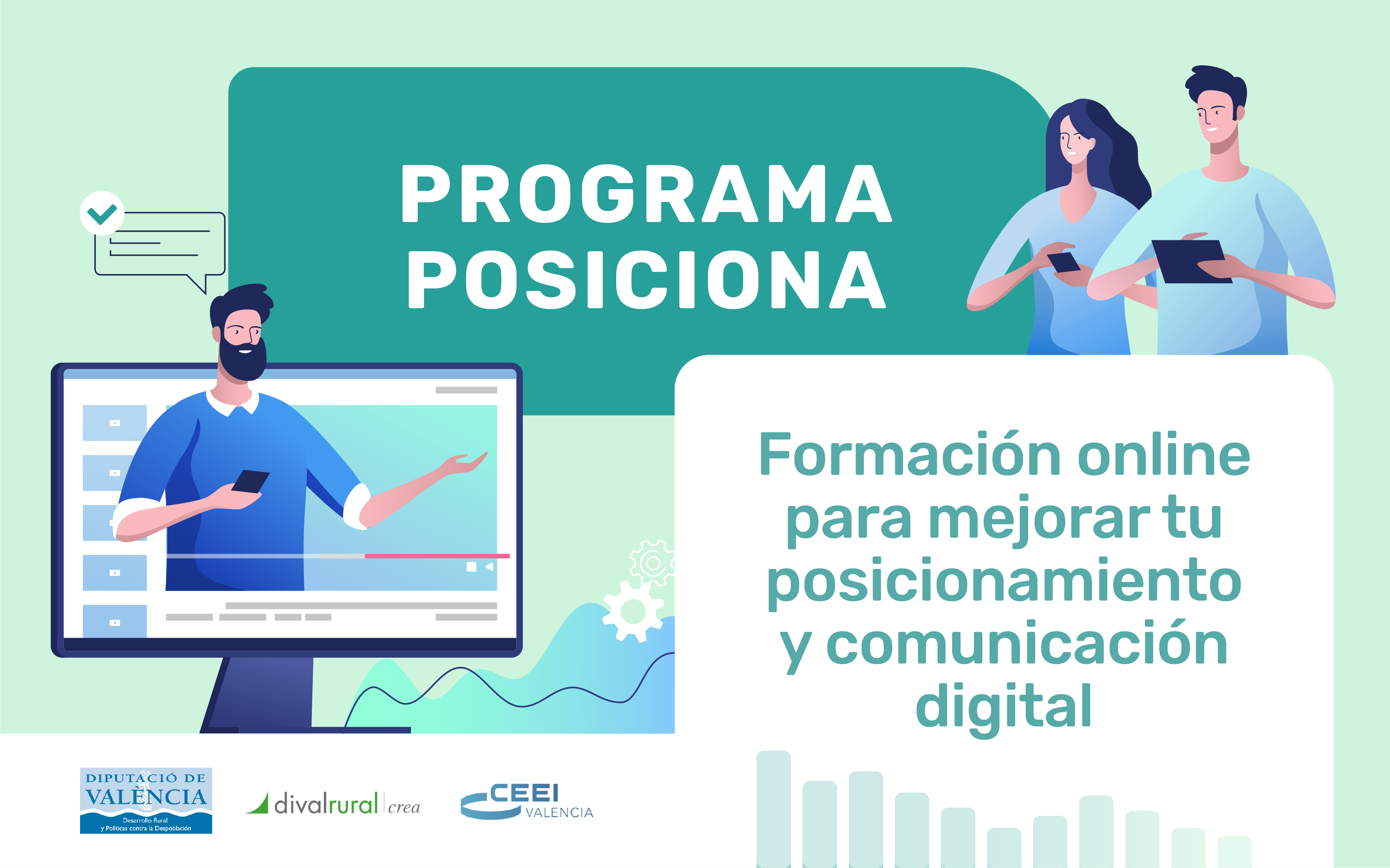 El Programa Posiciona es una iniciativa del CEEI Valencia, financiada por el Área de Desarrollo Rural y Políticas contra la Despoblación de Diputación de Valencia, que ofrece formación para mejorar tu posicionamiento y comunicación digital durante 3 sesiones.