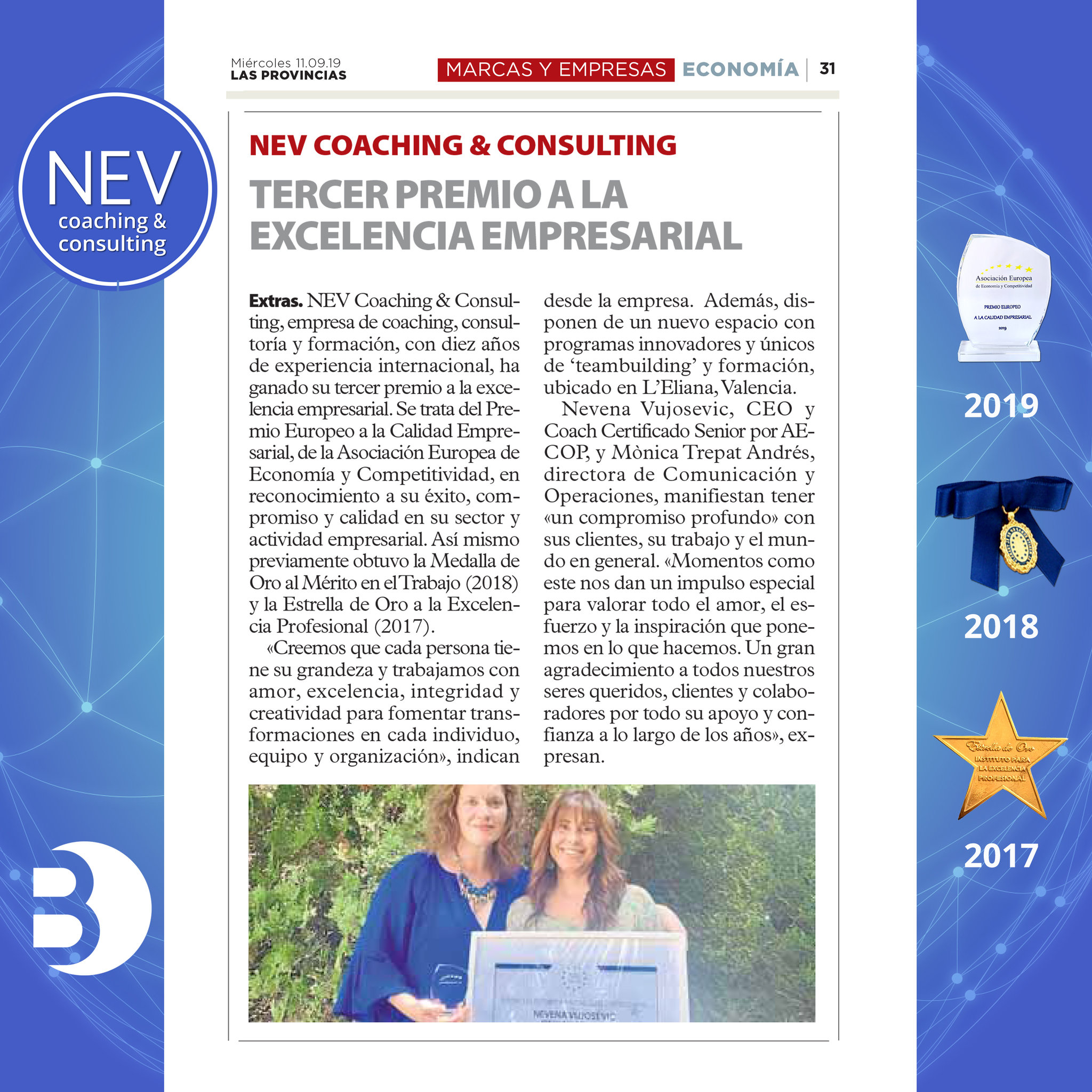 NEV Coaching & Consulting, empresa de coaching, consultoría y formación, con 10 años de resultados probados a nivel internacional, ha ganado su tercer premio en los últimos tres años a la excelencia empresarial. EPremio Europeo a la Calidad Empresarial, de la Asociación Europea de Economía y Competitividad, en reconocimiento a su éxito, compromiso y calidad en su sector y actividad empresarial. Así mismo previamente obtuvo la Medalla de Oro al Mérito en el Trabajo (2018) y la Estrella de Oro a la Excelencia Profesional (2017).