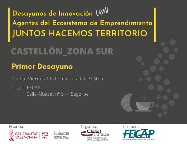Desayuno de innovación en Segorbe, con los Agentes del Ecosistema de Emprendimiento de la zona sur de Castellón, para compartir y poner en común las líneas a trabajar durante el 2022 y confeccionar conjuntamente un programa de acciones encaminadas a recuperar y fortalecer el tejido empresarial de la provincia de Castellón.