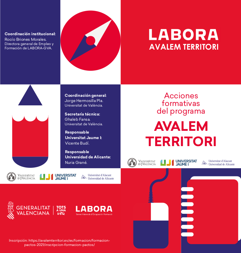 LABORA-GVA, junto con las Universidades de València, Alacant y UJI-Castelló, y la colaboración de los Acuerdos Territoriales por el Empleo de la Comunitat Valenciana, han organizado un CICLO DE JORNADAS dirigido al conocimiento del programa AVALEM TERRITORI.