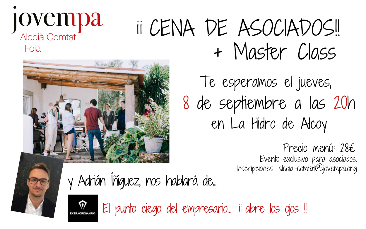 El jueves 8 de septiembre en el restaurante La Hidro de Alcoy tendremos una cena de asociados, tras la master class: El punto ciego del empresario ¡abre los ojos! con Adrián Ìñiguez de Extraordinario.