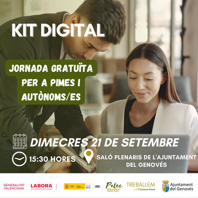 El próximo miércoles 21 de septiembre, tendrá lugar en el salón de plenos del Ajuntamiento de Genovés, una jornada dirigida a autónomo y pymes para conocer como acceder a los trámites para solicitar e BO KIT DIGITAL.