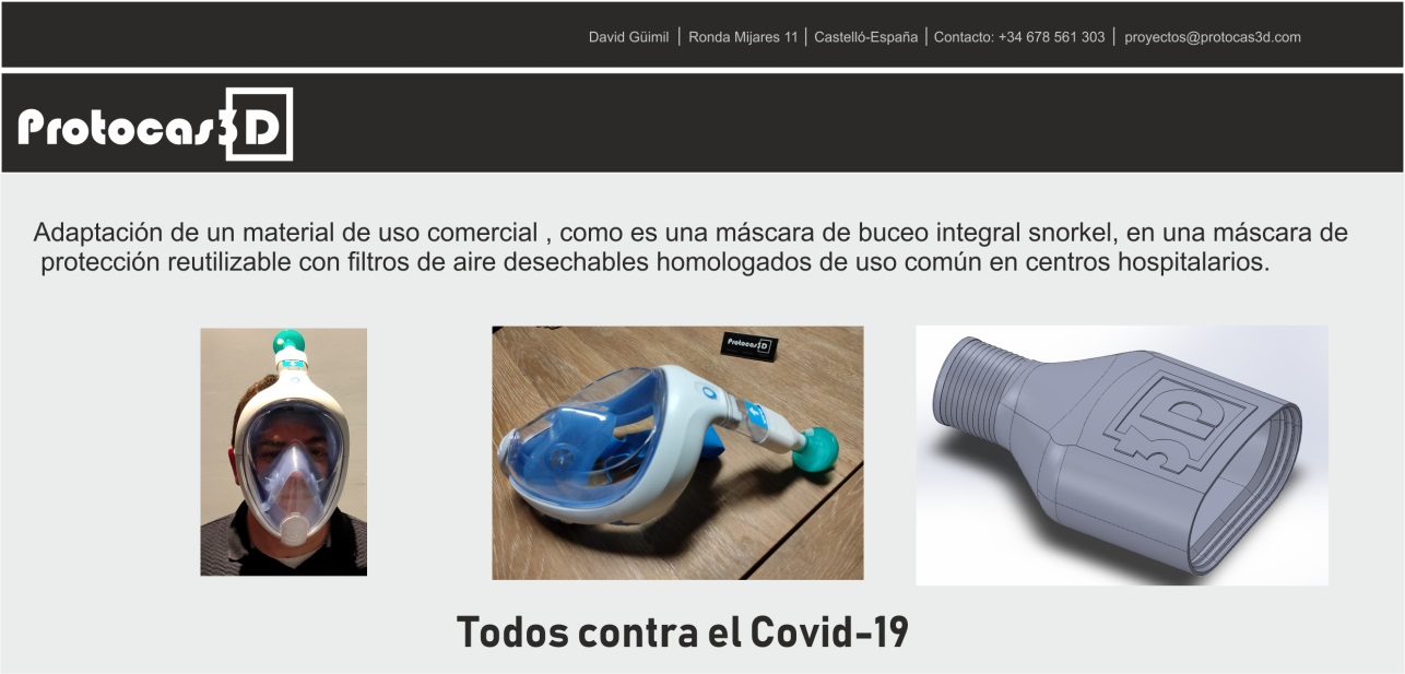 Se trata de una máscara de buceo integral snorkel, donde integran un conector impreso en 3D y hacen la máscara de protección reutilizable con filtros de aire desechables homologados, de uso común en centros hospitalarios.