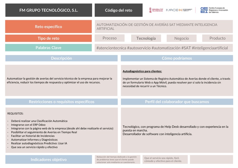 El reto consiste en Automatizar la gestión de averías del servicio técnico de la empresa para mejorar la eficiencia, reducir los tiempos de respuesta y optimizar el uso de recursos..