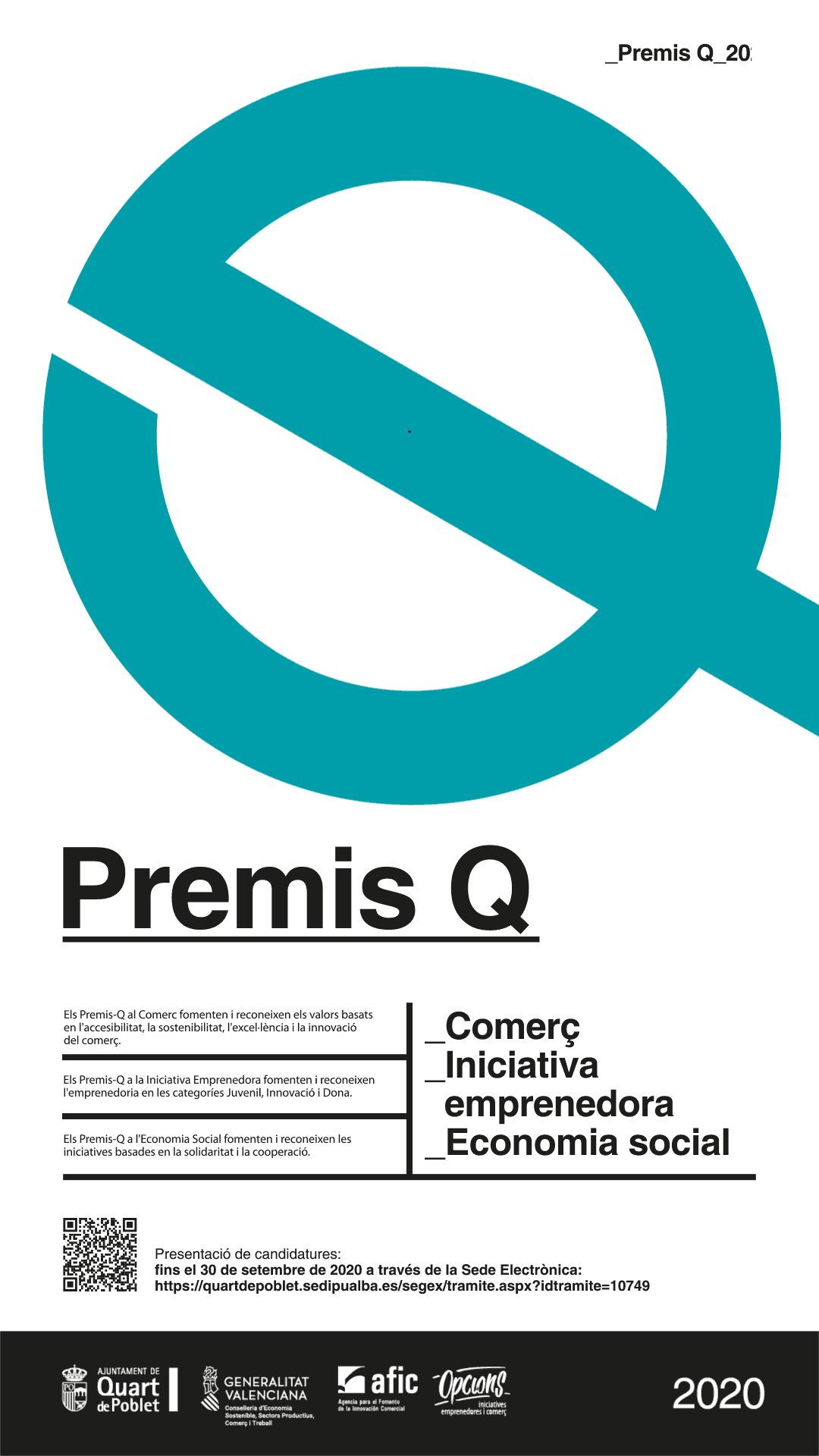 La concejalía de comercio, que dirige Angel Lorente, a través de la Agencia de Fomento de Innovación Comercial-AFIC y el Centro de Empleo y Desarrollo del Ayuntamiento de Quart de Poblet, ponen en marcha la convocatoria de los Premios "Q" al Comercio, la Iniciativa emprendedora y la economía social 2020.
