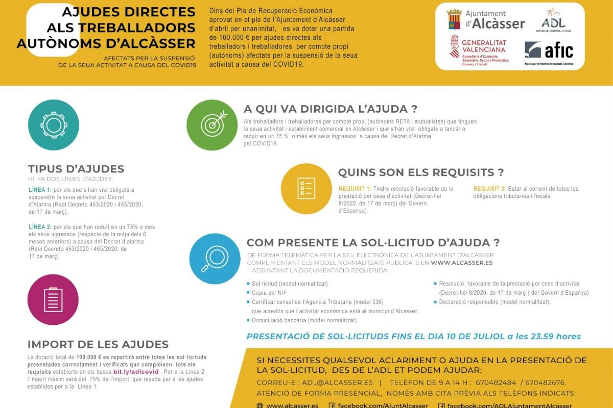 El Ayuntamiento de Alcàsser, desde la Concejalía de Promoción Económica, he arrancado un nuevo plan de ayudas para los autónomos de la localidad, enmarcado dentro del plan de Recuperación Económica que se aprobó por unanimidad el pasado mes de abril.