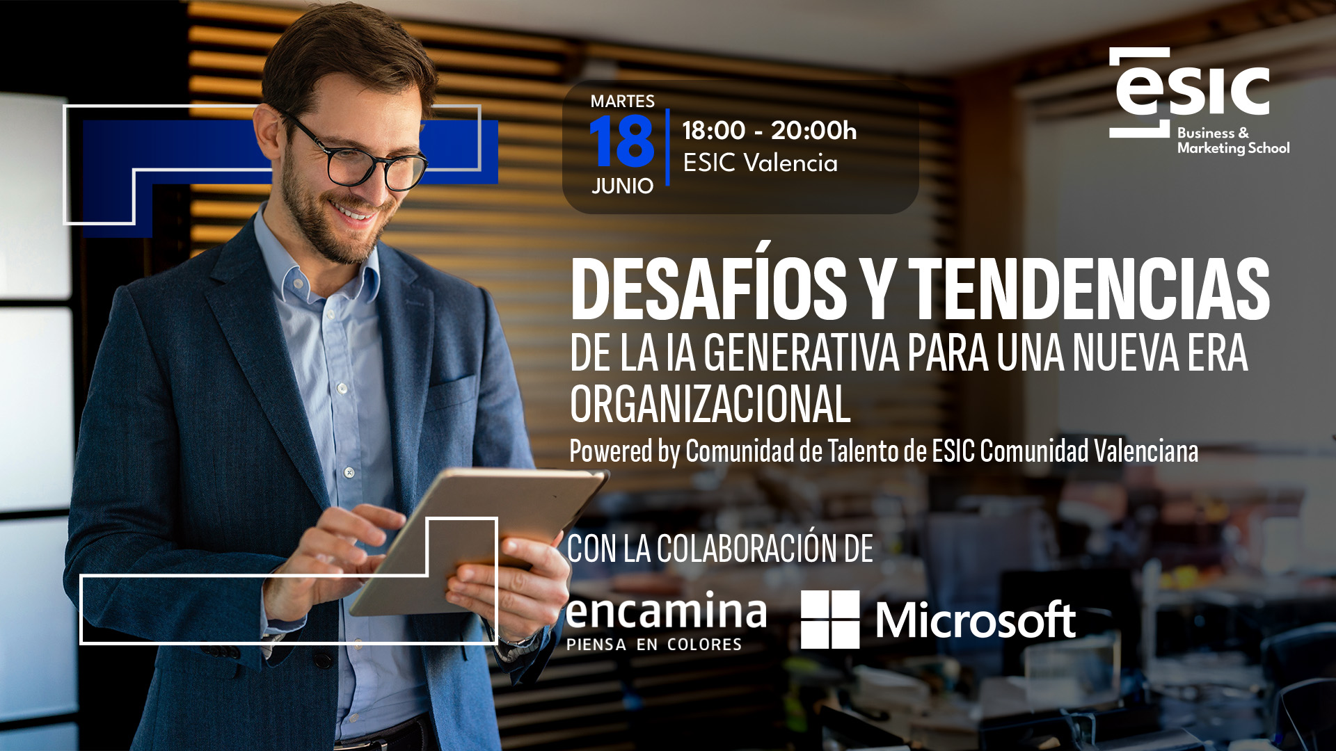 📅Martes 18 de junio  ⌚ 18.00 h a 20.00 h | 📍 Campus ESIC Valencia ( Avda. Blasco Ibáñez,55), Salón de actos.