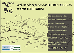 Durante los meses de febrero y marzo, el GAL Túria Calderona en colaboración con la delegación de Desarrollo Rural y Políticas contra la Despoblación de la Diputación de Valencia, han organizado un ciclo de webinars de EXPERIENCIAS Emprendedoras con raíz TERRITORIAL.