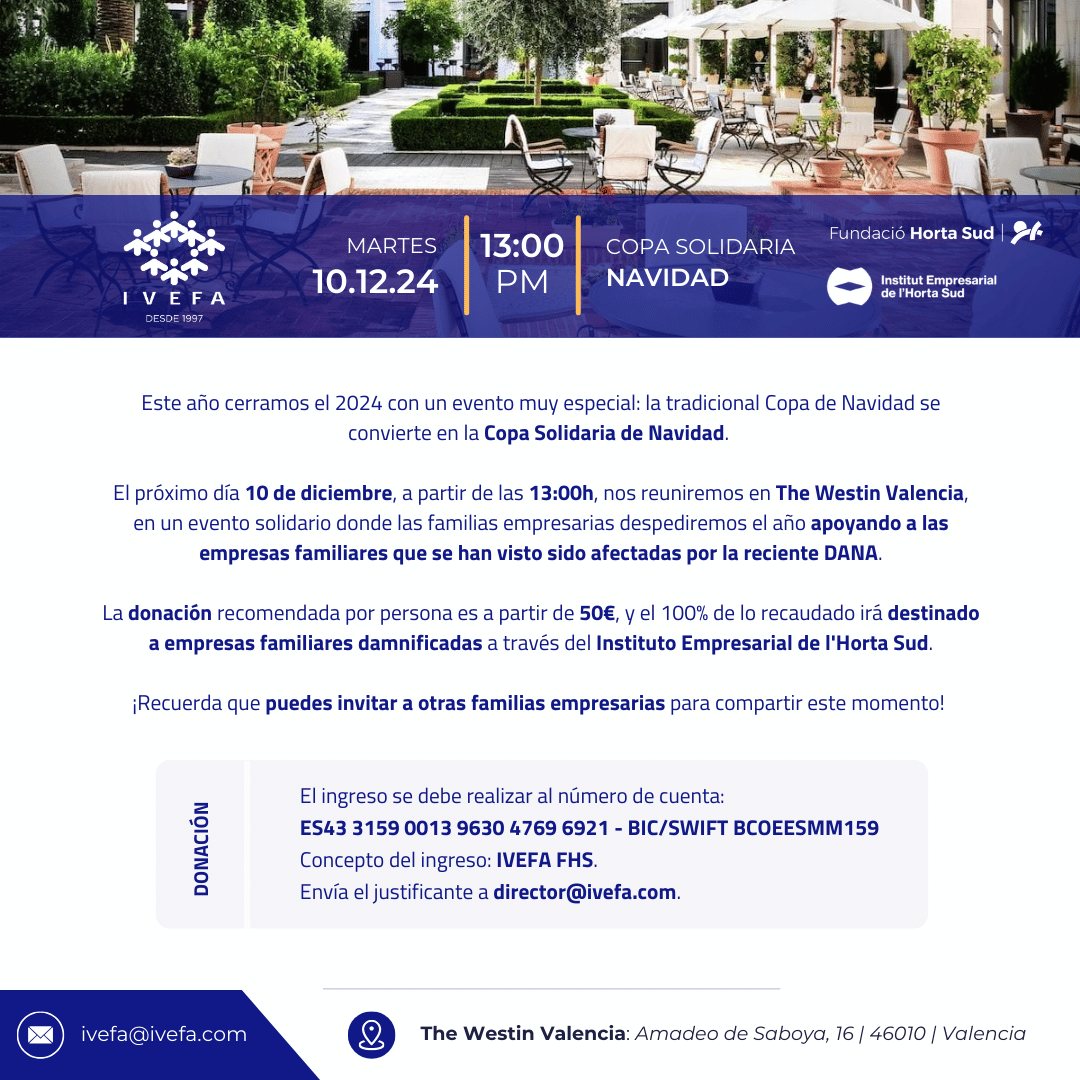 El próximo día 10 de diciembre, a partir de las 13:00h, nos reuniremos en The Westin Valencia, en un evento solidario donde las familias empresarias despediremos el año apoyando a las empresas familiares que se han visto afectadas por la reciente DANA.