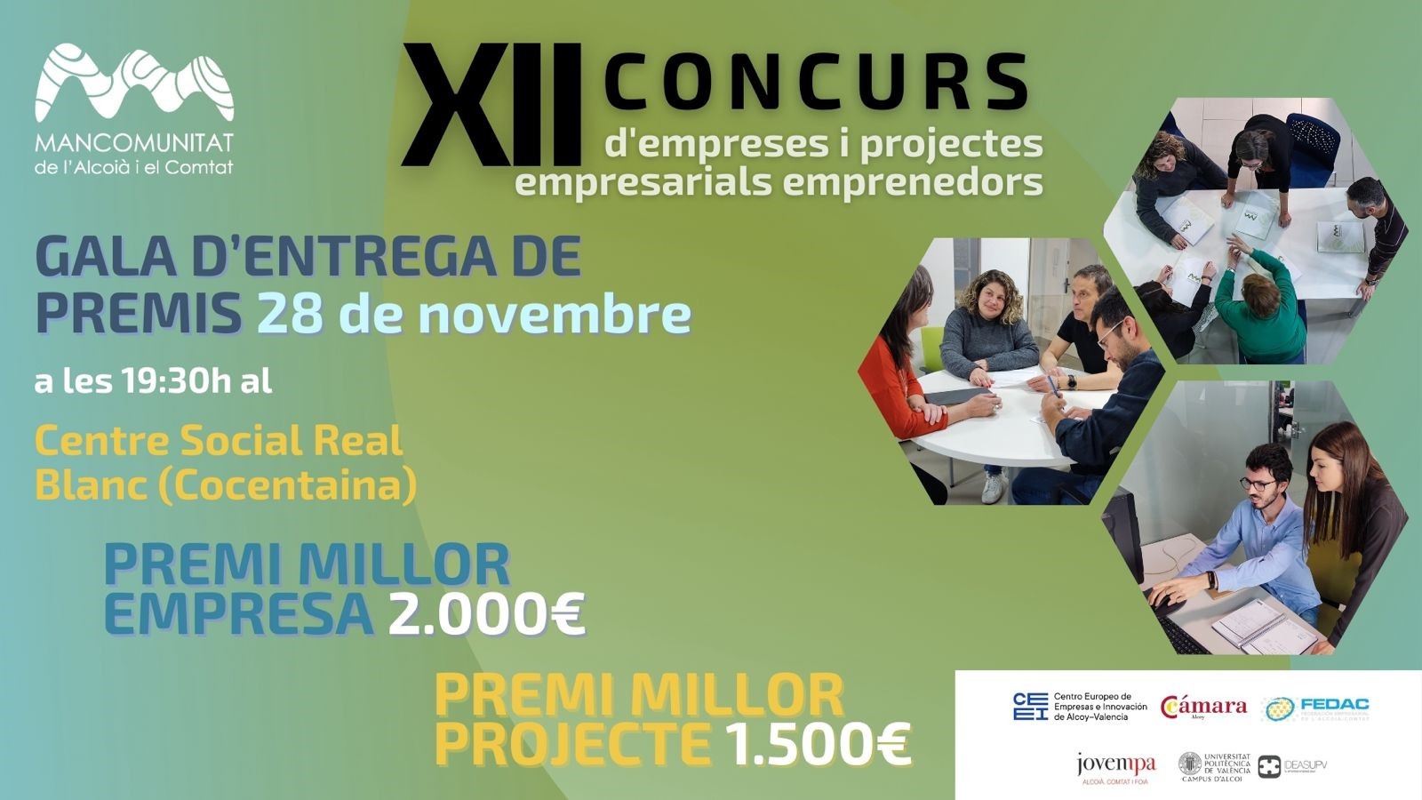 La Gala de entrega de los XII premios Concurso de Empresas y Proyectos Empresariales Emprendedores de la Mancomunitat de l’Alcoià i el Comtat tendrá lugar el próximo jueves, 28 de noviembre a las 19:30 horas en el Teatro Principal de Banyeres de Mariola.