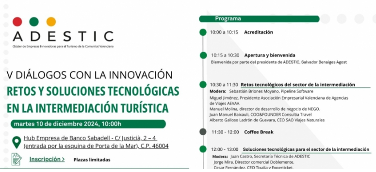 Con el objetivo de abordar estos desafíos y ofrecer soluciones innovadoras, ADESTIC, en colaboración con Pipeline Software, Doblemente Tecnología para el Turismo, Tixalia y Expertiket, organiza la jornada. El evento diseñado para profesionales del sector que buscan mantenerse a la vanguardia,, explorará los retos actuales que enfrenta la intermediación turística y descubrirá soluciones tecnológicas que están marcando tendencia en el sector. Los asistentes tendrán la oportunidad de participar en dos mesas redondas sobre Retos tecnológicos del sector de la intermediación y Soluciones tecnológicas para el sector de la intermediación que contará con la participación de expertos y profesionales del sector como: Miguel Jiménez, Presidente Asociación Empresarial Valenciana de Agencias de Viajes AEVAV, Manuel Molina, director de desarrollo de negocio de NEGO, Juan Manuel Baixauli, COO&FOUNDER Consultia Business Travel, Alberto Galloso, CEO SAO Viajes Naturales, Jorge Mira, Director comercial Doblemente, Cesar Fernández, CEO Tixalia y Experticket, Sebastián Briones, CEO Pipeline Software y Alberto Palomares Chust, Investigador VRAIN y Director Máster Universitario en Inteligencia Turística.