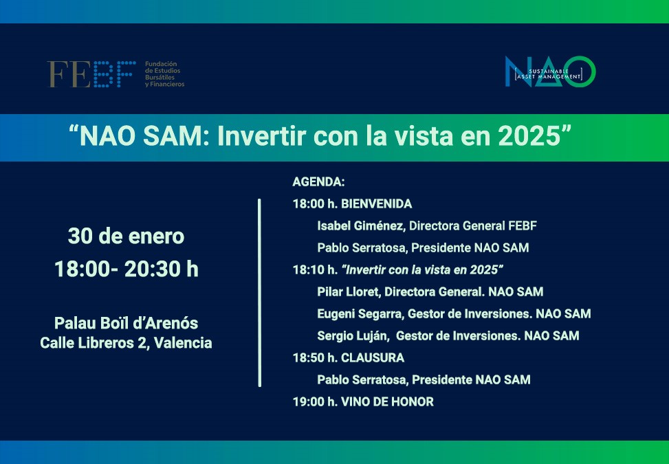 Jornada presencial que tendrá lugar el próximo jueves 30 de enero a las 18.00 horas, en el Salón de Actos de la Fundación de Estudios Bursátiles y Financieros con el título «NAO SAM: Invertir con la vista en 2025» con la participación del equipo de NAO SAM.
