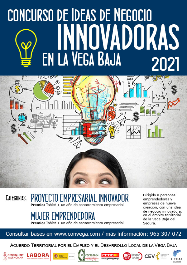 El ACUERDO TERRITORIAL PARA EL EMPLEO Y EL DESARROLLO LOCAL DE LA VEGA BAJA, integrado por el Consorcio para el Desarrollo Económico de la Vega Baja (Convega), las organizaciones sindicales Unión General de Trabajadores (UGT) y Comisiones Obreras (CC.OO.), la Confederación Empresarial de la Comunidad Valenciana (CEV) y la Unión Empresarial de la Provincia de Alicante (UEPAL), convoca el “Concurso de Ideas de Negocio Innovadoras en la Vega Baja 2021”, con el objetivo de fomentar la cultura emprendedora en el ámbito comarcal, potenciando la creación y consolidación de negocios e iniciativas empresariales innovadoras que contribuyan al desarrollo económico sostenible de la comarca de la Vega Baja del Segura.