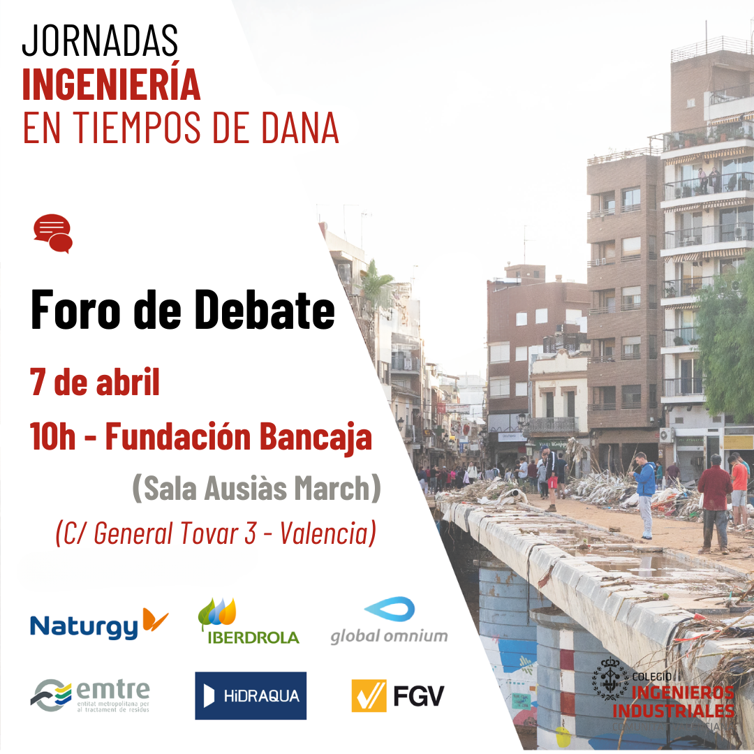 El próximo lunes 7 de abril, tenemos la jornada de clausura y conclusiones del Ciclo de las Jornadas gratuitas sobre el aporte de valor de la Ingeniería en tiempo de Dana.