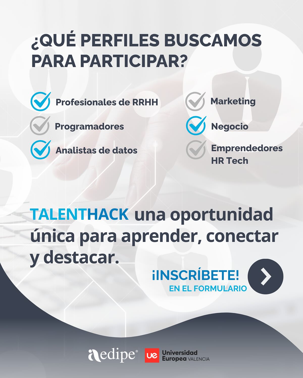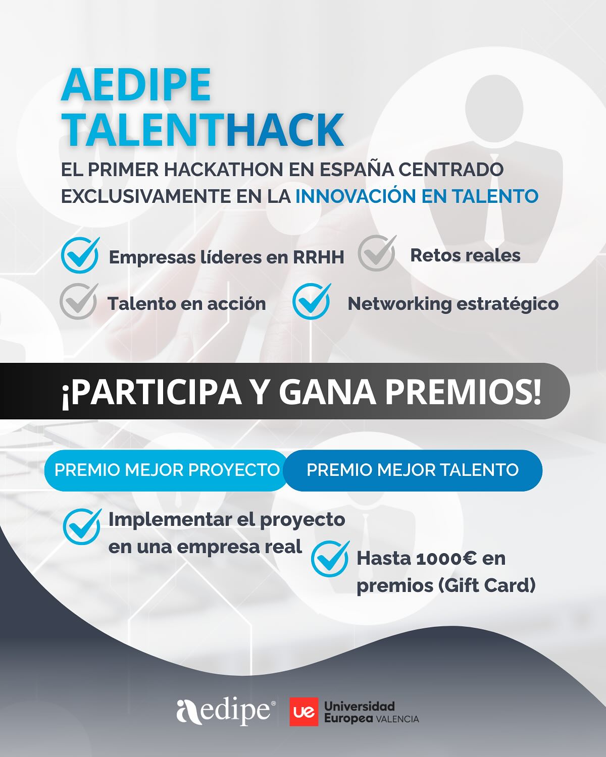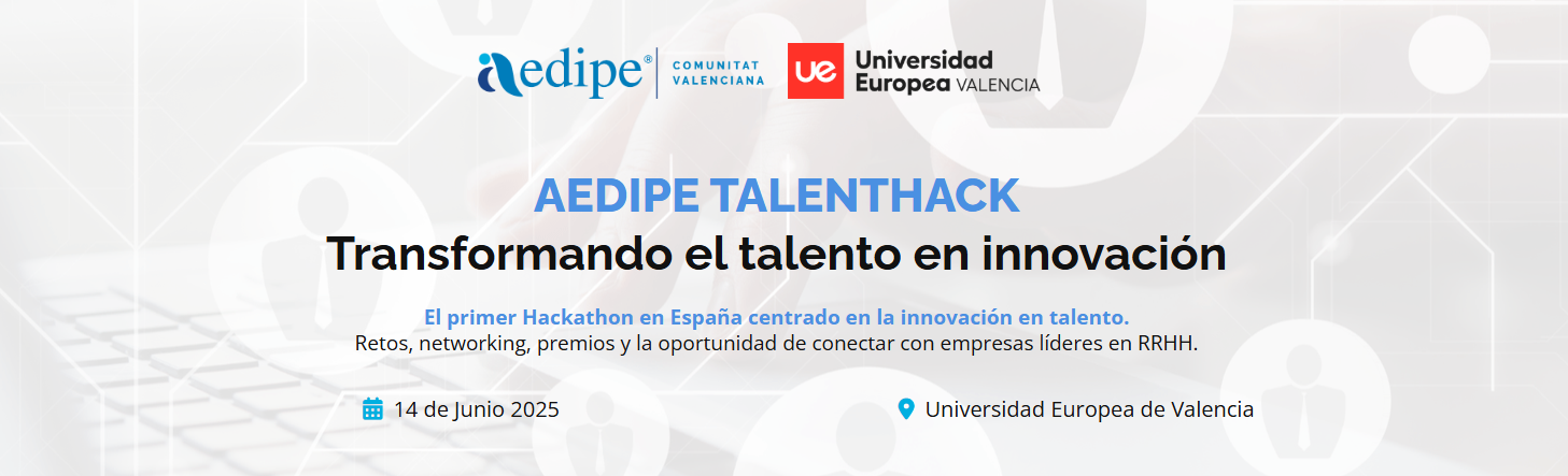 El evento AEDIPE TALENTHACK reunirá a profesionales de referencia y empresas asociadas a AEDIPE con jóvenes talentos para cocrear soluciones aplicables a retos actuales en atracción, desarrollo y fidelización del talento. Una experiencia donde se combinarán creatividad, tecnología y colaboración intergeneracional.
