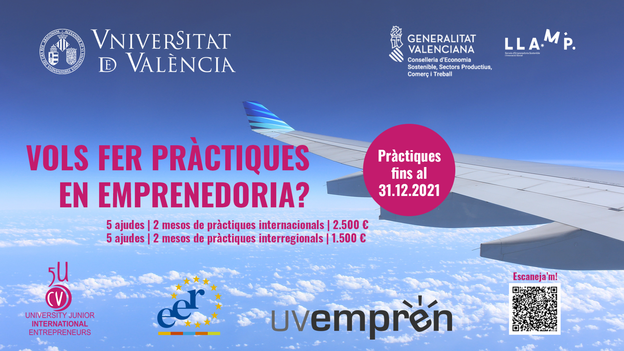 El estudiantado de la Universitat de València ya puede solicitar su participación en la 7ª edición de las Prácticas Internacionales y Nacionales de Emprendimiento. El Vicerrectorado de Empleo y Programas Formativos, con la financiación de la Generalitat Valenciana, pone en marcha esta acción.