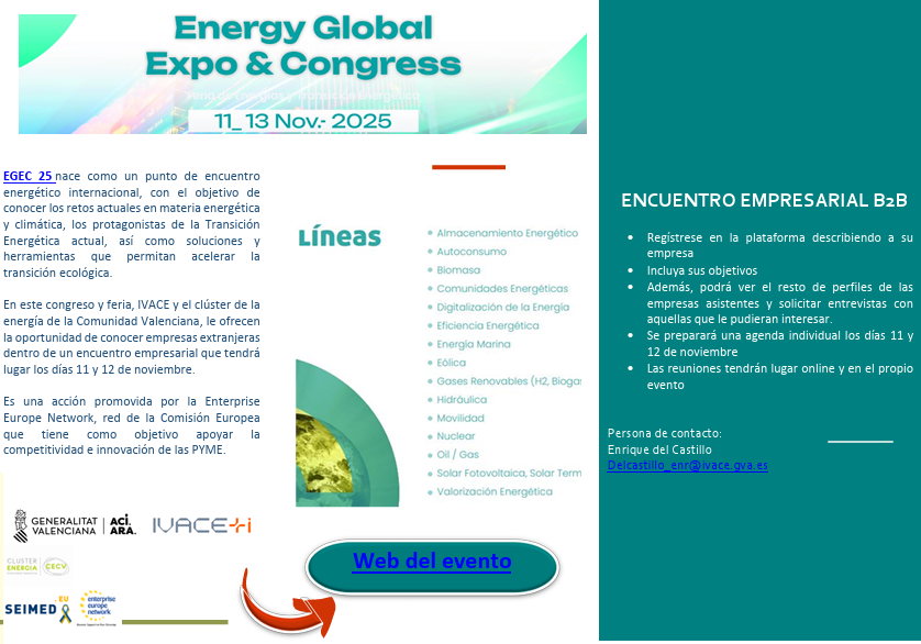 EGEC 25 nace como un punto de encuentro energético internacional, con el objetivo de conocer los retos actuales en materia energética y climática, los protagonistas de la Transición Energética actual, así como soluciones y herramientas que permitan acelerar la transición ecológica. En este congreso y feria, IVACE y el clúster de la energía de la Comunidad Valenciana, le ofrecen la oportunidad de conocer empresas extranjeras dentro de un encuentro empresarial que tendrá lugar los días 11 y 12 de noviembre. Es una acción promovida por la Enterprise Europe Network, red de la Comisión Europea que tiene como objetivo apoyar la competitividad e innovación de las PYME.