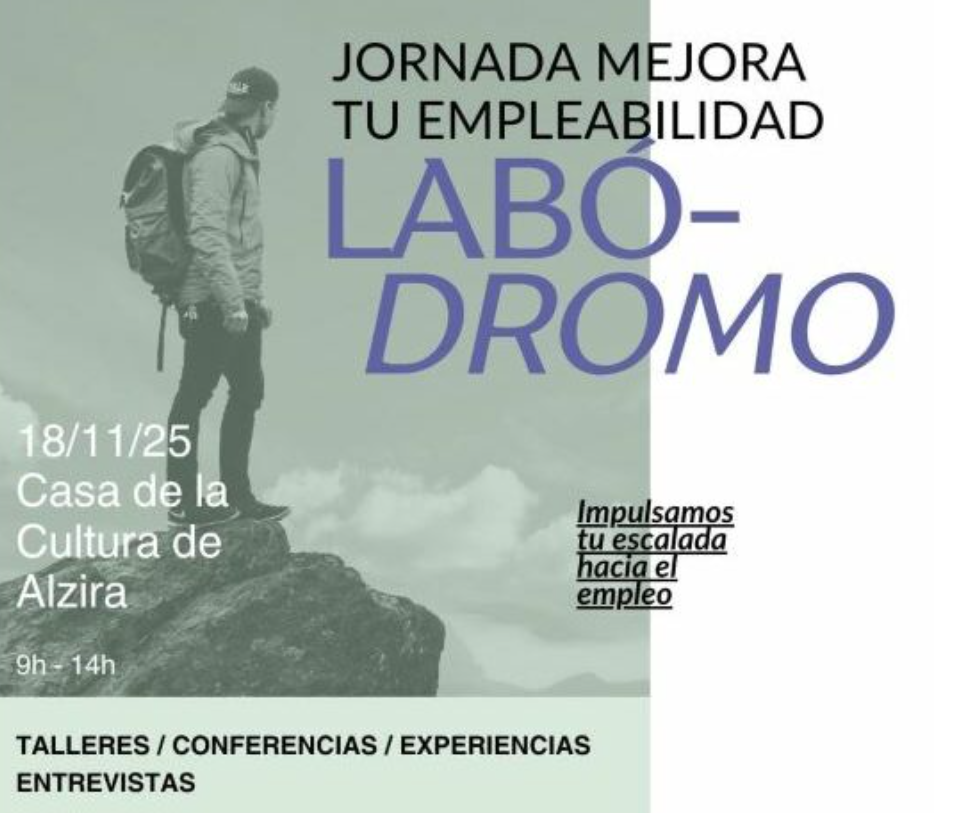 El martes 18 de noviembre, de 9:00 a 14:00 horas, en la Casa de la Cultura de Alzira, se celebrará el primer LABÓDROMO, una jornada de mejora de la empleabilidad, un evento imprescindible para todas aquellas personas que buscan empleo, desean dar un salto en su carrera profesional o impulsar sus proyectos de emprendimiento. Será un espacio innovador y transformador, donde empresas, técnicos especializados y voluntariado pondrán su conocimiento y experiencia al servicio de los participantes, acompañándolos de manera personalizada en un recorrido que puede abrir nuevas oportunidades reales en el mercado laboral.